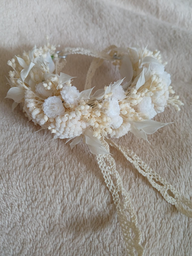 Bracelet adulte ou enfant en fleurs séchées blanches.Coloris blanc.