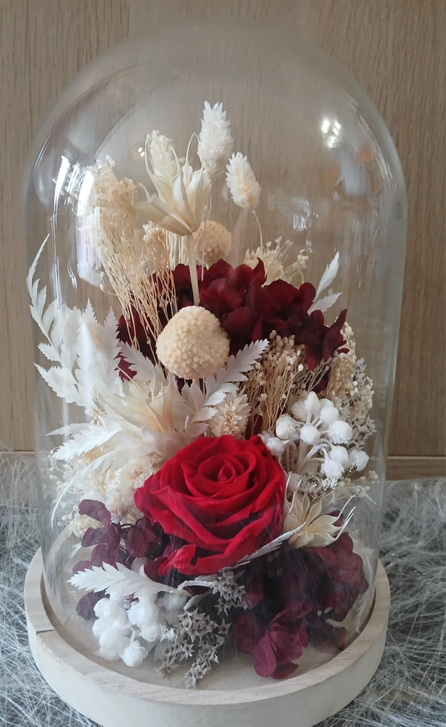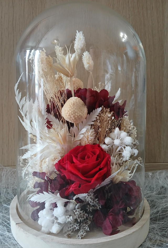 Grande cloche en verre hauteur 28 cm réalisé en fleurs séchées et stabilisées.Ideal cadeau saint Valentin.