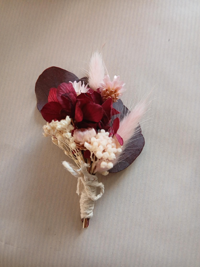 Boutonnière marié ou témoin réalisée en fleurs séchées et stabilisées.